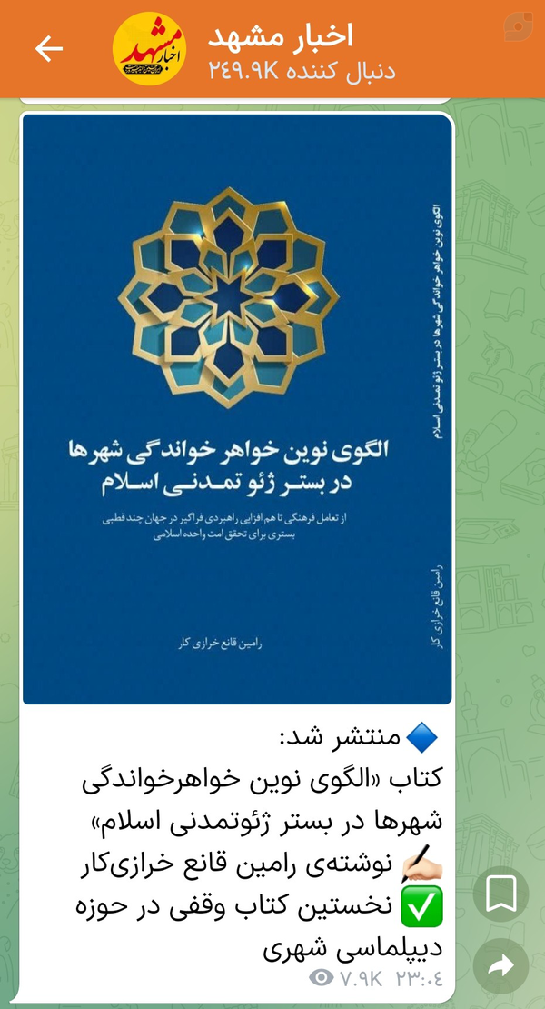 📘 منتشر شد!«الگوی نوین خواهرخواندگی شهرها در بستر ژئوتمدنی اسلام»🔹 نگاهی نو به دیپلماسی شهری در راستای تحقق امت واحده اسلامی🔸 دعوتی برای بازاندیشی در پیوند شهرها، دلها و آرمانها⬅️هزینه کتاب :رایگان هزینه ارسال:75 هزار تومان #دیپلماسی_شهری #امت_واحده #ژئوتمدن_اسلامی #خواهرخواندگی