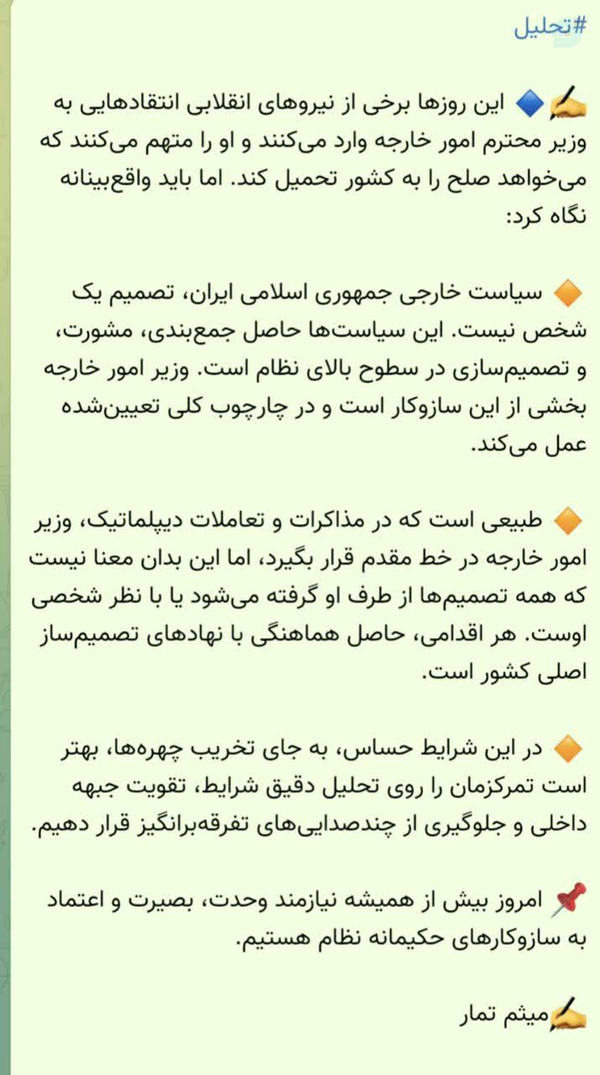 این متن رو که در کانالم گذاشتم حتما حتما حتما بخونید و از جمله کسانی که دارند وزیر امور خارجه را تخریب میکنند