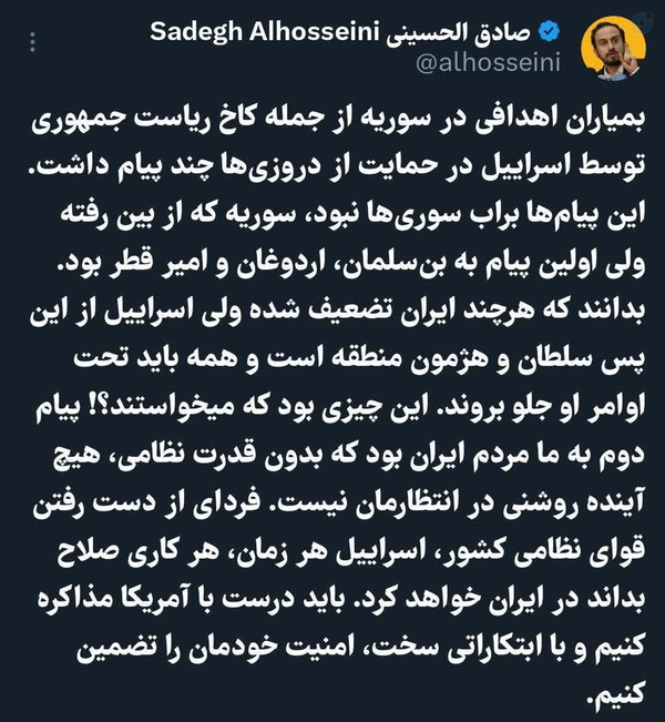 این فرد از افراد نزدیک به #دولتپزشکیان هست. قبلا عرض کردم #نفوذ در این جریان سیاسی #دوتابعیتی بیداد میکند و کشور را به نابودی و تجزیه میکشاند.این پیامیعنی #دولت_اصلاحطلب_پزشکیان قدرت بزرگ ایران اصلا نمیبیند .همان تفکر ظریف که کشور بایک دکمه آمریکا نابود میشود را معتقدانه پیگیری میکند.