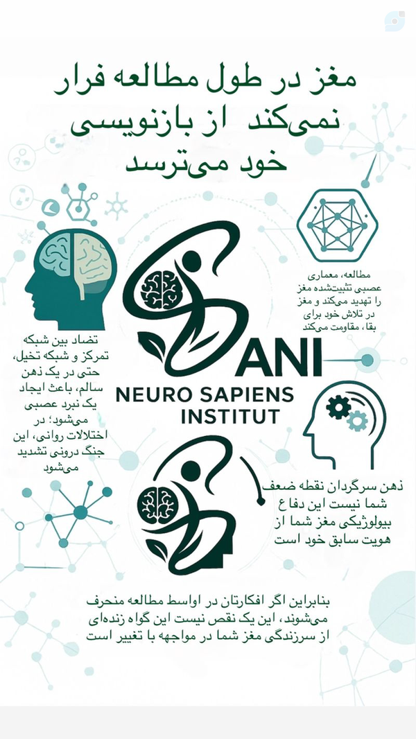 مغز در طول مطالعه فرار نمیکند، از بازنویسی خود میترسد:تضاد بین شبکه تمرکز و شبکه تخیل، حتی در یک ذهن سالم، باعث ایجاد یک نبرد عصبی میشود؛ در اختلالات روانی، این جنگ درونی تشدید میشودمطالعه، معماری عصبی تثبیتشده مغز را تهدید میکند و مغز در تلاش خود برای بقا، مقاومت میکند.ادامه در #ویرشت چرخه رفتار میتونه ساده ولی بازخوردش میتونه پیچیده باشه.پس در این چرخه خوب دقت کن و تأمل و مرحله به مرحله انجامش بده