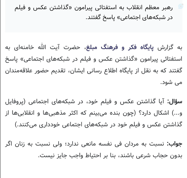 این فتوای کلی‌ستهر چیزی که خوف مفسده داشته باشد حرام استدوما الآن بحث حلال و حرام نبود بحث کسی‌ست که برای خودش ارزش قائل نیستسوما حجاب چیست؟ فقط پوشاندن مو؟ چهره را هفت قلم آرایش کنند و هفت لایه فتوشاپ بعد با چادر بگذارند در دید عموم موردی ندارد؟