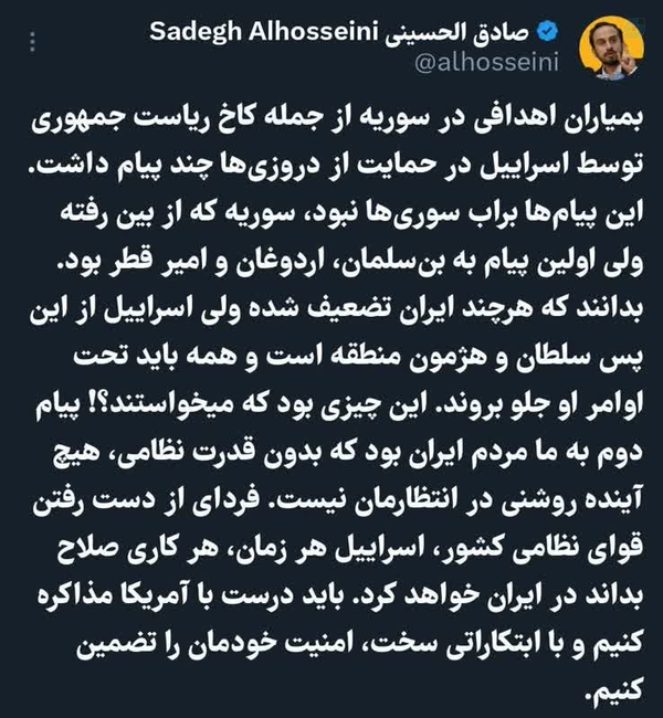 ❌ خط جدید جریان نفوذ درون ساختار نظام را ازین توییت میتوان به راحتی فهمیدایشان از عناصر رسانه ای نزدیک به دولت هستند. گفته ایران ضعیف شده و قوای نظامی ما بسمت ناتوانی و ضعف قدرت رفته اند . دیر بجنبیم اسرائیل بر ما مسلط میشود، برای نجات از سلطه اسرائیل چاره کار چیه ؟