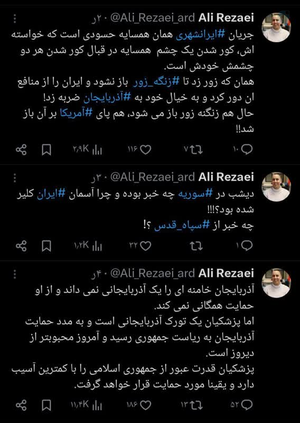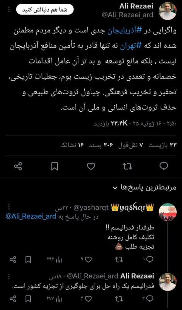 @montzeran18 July 2025الان هم نشسته در دامن الهام علیاف با شبکه خود در داخل ایران خط نفوذ خود را ادامه میدهد.به همت این جاسوسان رژیم صهیونیستی با حساسیت زدایی از اقدامات خصمانه دولت آذربایجان و حضور اسرائیل، تکفیریها در مرزهای شمالی، آذربایجان را تبدیل به پیچیدهترین پایگاه اسرائیل، آمریکا، ناتو در منطقه کرده است.