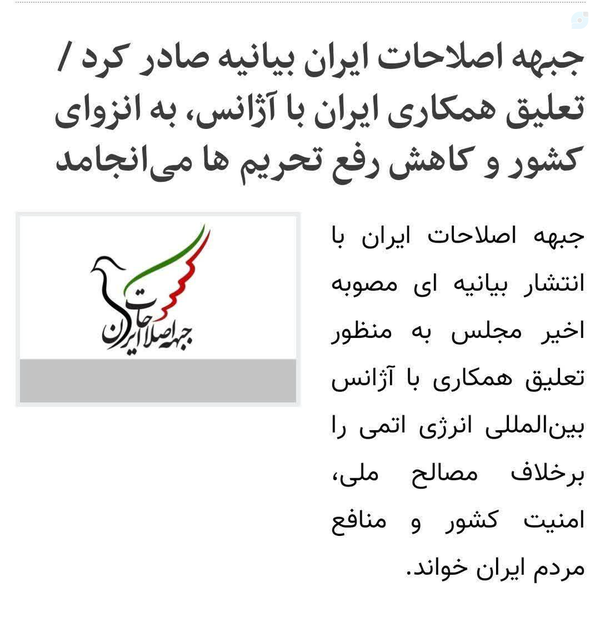 جبهه اصلاحات در بیانیهای، تعلیق همکاری با جاسوس_بازرس های آژانس را خلاف مصلحت کشور و امنیت ملی خواند!✍الان آمریکا و اسرائیل نیاز به اطلاعات جدید برای انجام حملات جدید دارند و تنها جاسوس های آژانس میتوانند این اطلاعات را برای دشمن جمع آوری کنند.. اصلاحات توجه جدی به نیازهای دشمن بی رحم دارند.