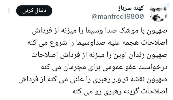 @Cyrosirooni9 July 2025Replying toستون پنجم دشمن در کشور که رها شده اند به حال خودشان هیچ سکاندار هم شده اند...
