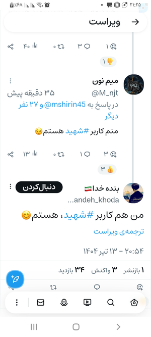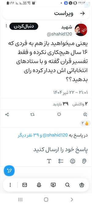 @Karimiatefeh13 July 2025Replying to and 33 othersچند بار گزارش اختلاف افکنی ارسال کردم بهش ی پیام تذکر ارسال میکنن و تمام بهترین کار عدم توجه به این جرثومه ی نفاق و دوستگی هست ولی خب جناب ایروانی ترجیح میده همچنان برا سرگرمی و تفریح با اینا سر و کله بزنه