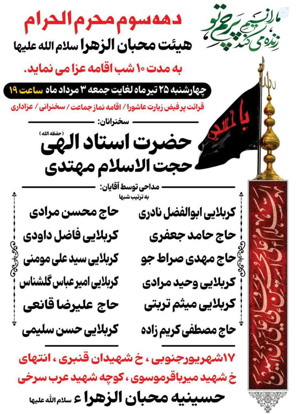 برنامه #سخنرانی#استادالهی در دهه سوم #محرم:▪️به مدت ۴ شب:▪️چهارشنبه ۲۵ تیر▪️جمعه ۲۷ تیر▪️شنبه ۲۸ تیر▪️یکشنبه ۲۹ تیر▪️سخنرانی بلافاصله بعد از نماز مغرب و عشاء▪️#تهران، انتهای ۱۷ شهريور جنوبی، خ شهیدان قنبری، خ شهید میرباقرموسوی، کوچه شهید عرب سرخی، حسینیه محبان الزهراء سلام الله علیها