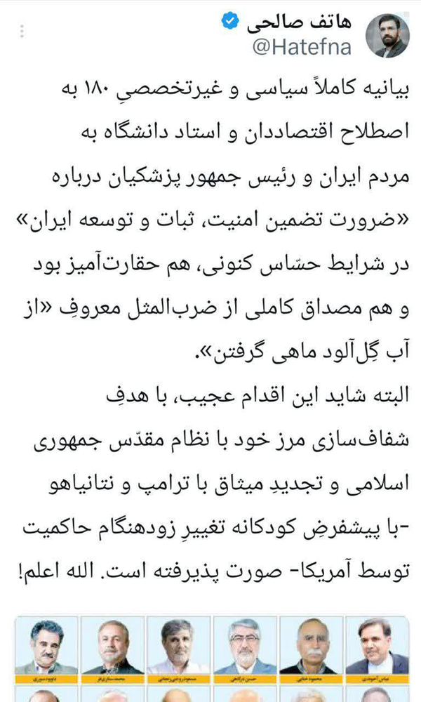 (هاتف صالحی، رسانهای):بیانیه کاملاًسیاسی و غیرتخصصیِ۱۸۰به اصطلاح اقتصاددان و استاددانشگاه به مردم ایران و رئیس جمهور پزشکیان درباره «ضرورت تضمین امنیت، ثبات و توسعه ایران» درشرایط حسّاس کنونی، هم حقارتآمیزبود و هم مصداق کاملی از ضربالمثل معروفِ «از آب گِلآلود ماهی گرفتن».البته شاید این اقدام