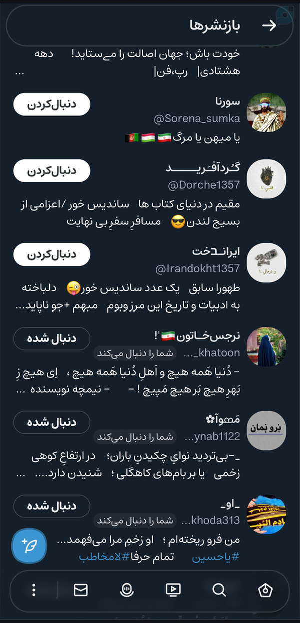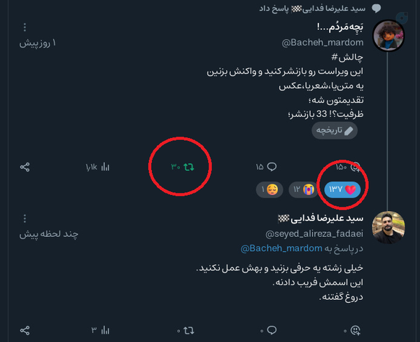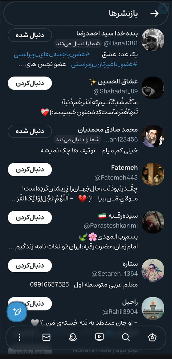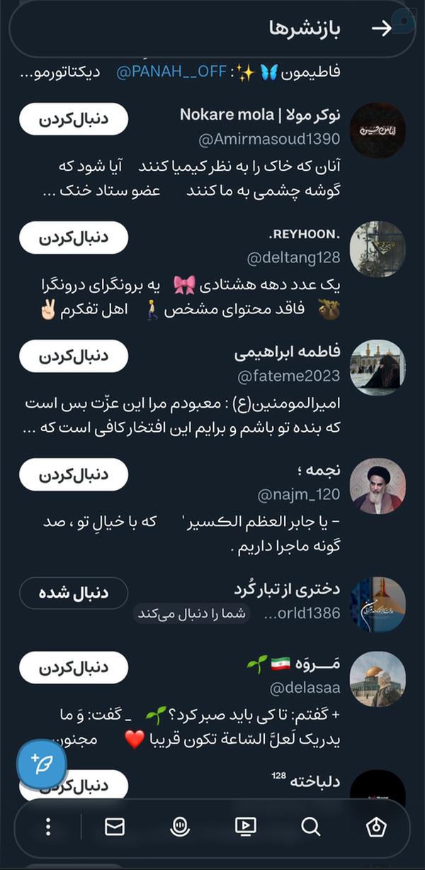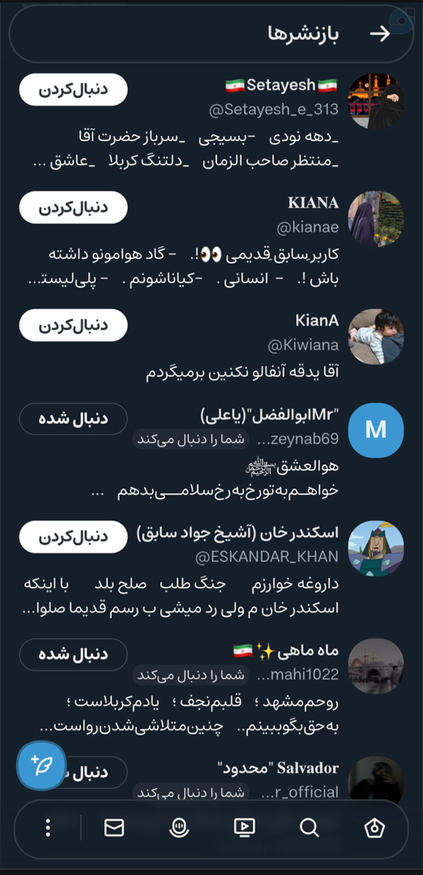 @Bacheh_mardom11 July 2025Replying toپس الکی نگیداولا وقت گذاشتم روش چون تهمت زدید!دوما من دائم اینجا نیستم که لحظه به لحظه چک کنم!میزارم ظرفیت تکمیل شه بعد همه روبا هم میفرستم اون 16 نفر اولیه همون لحظه بازنشر کردن و منم همون لحظه گذاشتم برای بقیه افراد هم گذاشتم تک به تک!شما هم تهمت نزنید!ن ا دنبال کنندگان من هستی ن منومیشناسی