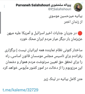 12 July 2025چراغ دوم رو هم پروانه سلحشوری روشن کرد آره آره بیاید برامون از انسجام ملی حرف بزنیدهر کی حرف زد با اینا مخالف وحدتن خفه شون کنید تحویل بگیرید حضرات