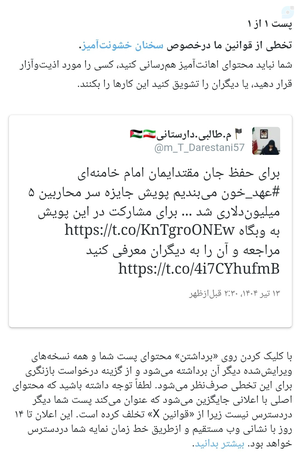 با ۲۰ میلیون دلاری شدن جایزهی کشتن دشمنان امام خامنهای،ایلان ماسک ترسید و پویش #عهد_خون در توییتر حذف شد ... برای ایجاد ترس بیشتر در دل صهیونیسم بین الملل و ایادی داخلی شیطان بزرگ ، لطفا پویش را به دیگران معرفیکنیدبرای همراهی با پویش به وبگاه زیر مراجعه کنید: thaar.ir