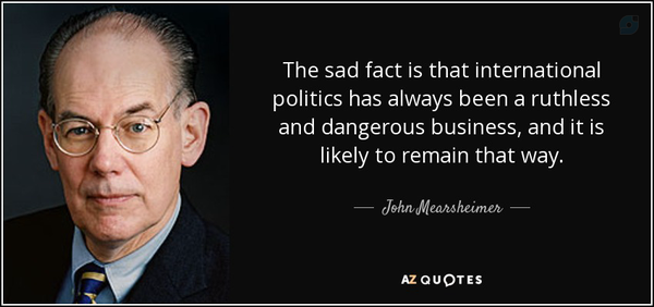 «واقعیت غمانگیز این است که سیاست بینالملل همیشه یک تجارت بیرحم و خطرناک بوده است و احتمالاً به همین شکل باقی خواهد ماند.»برای دوستانی که مرشایمر می خوانند.