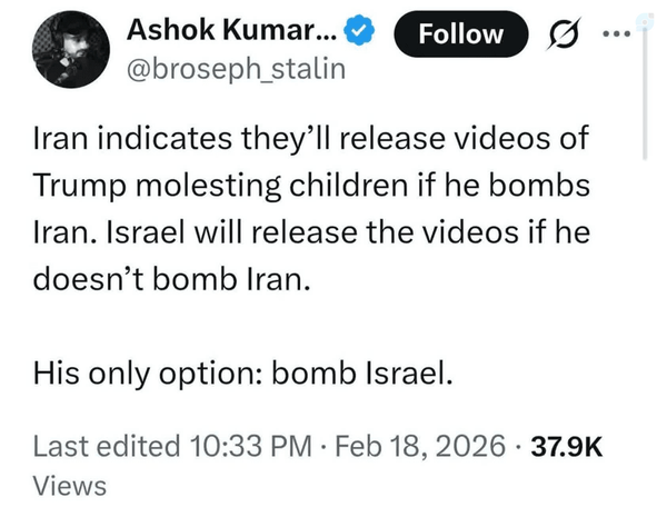 🔺ایران اعلام کرده در صورت حمله ترامپ به ایران، ویدیوهای کودک آزاریش رو منتشر می کنه. ❌اسرائیل هم در صورت عدم حمله به ایران، این ویدیوها رو منتشر میکنه.✅ تنها گزینهٔ ترامپ: بمباران اسرائیل!😂😂😂