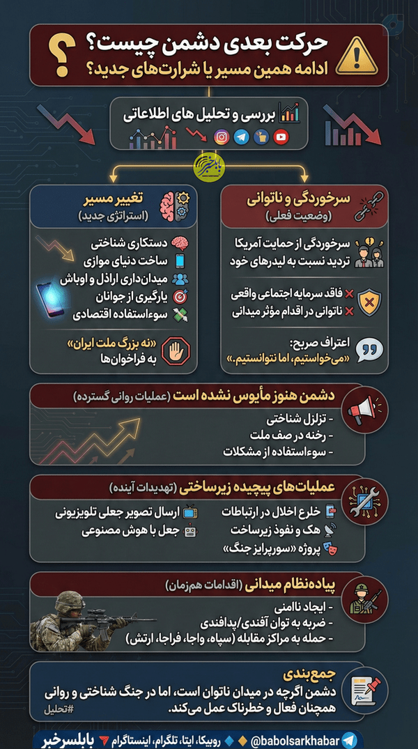 ⚠️ #اینفوگرافی | حرکت بعدی دشمن چیست؟🧠 تحلیلهای اطلاعاتی نشان میدهد گروهکهای ضدانقلاب:دچار سرخوردگی از حمایت آمریکا شدهاندبه ناتوانی لیدرهای خود در عملیات میدانی رسیدهاندفاقد سرمایه اجتماعی و توان اقدام مؤثرند🗣 اعتراف صریح دشمن در جنگ ۱۲روزه:«میخواستیم، اما نتوانستیم.»#مرگ_بر_آمریکا
