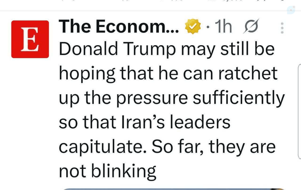 💠 اکونومیست:🔹️ترامپ شاید همچنان امیدوار باشد که بتواند فشارها را آنقدر افزایش دهد تا رهبران ایران تسلیم شوند. اما تاکنون آنها هیچ نشانهای از عقبنشینی نشان ندادهاند. @meyarpb