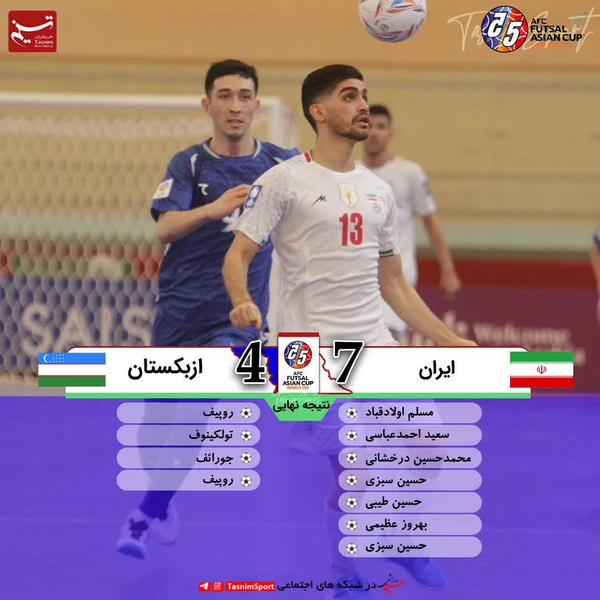 @KhabarVarzeshi1233 فبراير 2026صعود فوتسال ایران به نیمه نهایی با شکست ازبکستان⚽️ تیم ملی فوتسال کشورمان در نخستین دیدار از مرحله یکچهارم نهایی جام ملتهای فوتسال آسیا ۲۰۲۶، در سالن ولودروم جاکارتا به مصاف تیم ملی ازبکستان رفت و با نتیجه ۷ بر ۴ به برتری رسید و به جمع چهار تیم پایانی آسیا راه یافت. #KhabarVarzeshi