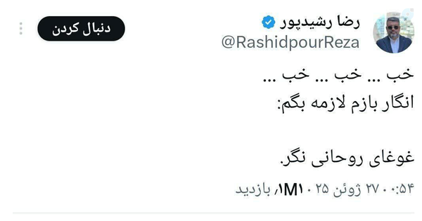 ❌ آخرین شرارت رشیدپور را ببینیداین توییت توسط این موجود زمانی منتشر شد که رهبر انقلاب توسط آمریکا و اسرائیل تهدید به ترور شد.و تا این لحظه هیچ باغیرتی در نظام جمهوری اسلامی با رشیدپور برخورد نکرده که هیچ بلکه توسط فرهیختگان و روبیکا هم مورد تفقد و عنایت و تبلیغ قرارگرفته