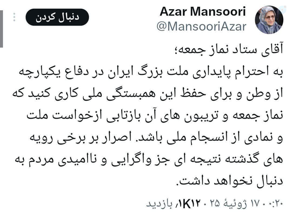 17 July 2025خانم آذر منصوری و علاقهی وافرشون به سگ رو یادتونه که؟ایشون هم نگران حضور #آیت_الله_صدیقی در نماز جمعه شدن خدایا ما رو با اینها هیچ وقت تو یه صف قرار نده