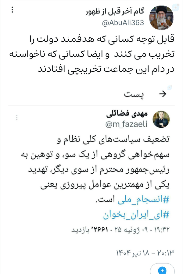@AbuAli36310 July 2025Replying to and 24 othersجرم یا خطای پزشکیان در حد استیضاح بوده؟طرح این مسئله چقدر به انسجام ملی ضربه زده ؟ نه اینکه میزند.اینها دنبال اختلاف بودند که علی الظاهر موفق شدن.یه عده به اسم اصلاحات نامه زدن به آژانس و سازمان ملل .یعنی افراطی های اصلاحات و افراطی های سوپر انقلابی موفق شدند علیه انسجام عملیات کنند .