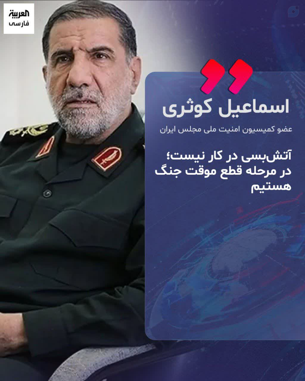 اسماعیل کوثری، عضو کمیسیون امنیت ملی مجلس ایران به وبسایت «دیدهبان ایران» گفت: «هیچ آتشبسی در کار نیست و اکنون در مرحله قطع موقت جنگ هستیم.»