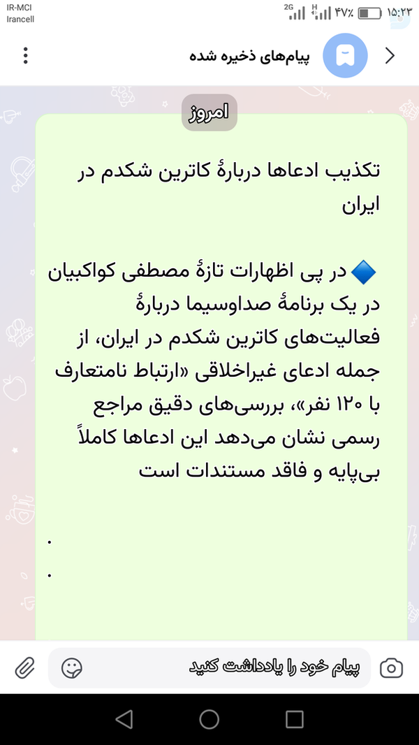 تشویش اذهان عمومیاهانت به مسئولین بلندپایه کشورتهمت به نظام جمهوری اسلامی و آبروریزی در مجامع بین المللی، دست پخت کواکبیان باید با اشد مجازات جواب داده شودفقط یک کشور لاابالی میتواند این همه توهین و بی شرمی را از یک فرد خودی، داشته باشد تتبیه و مجازات کواکبیان باید درس عبرتی شود برای همه