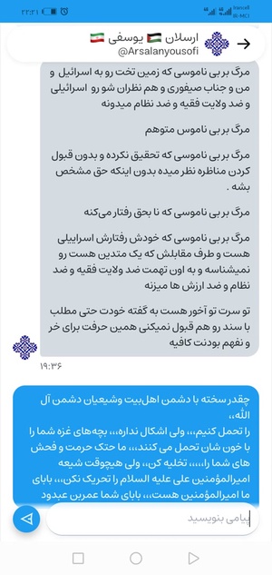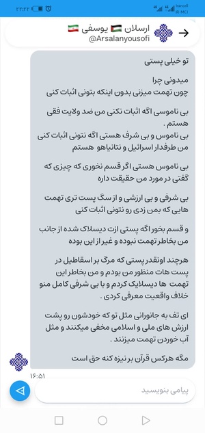 @hsynadynh826 April 2024Replying to and 15 othersجناب اکانت هورب العرش عظیم ، اگه هنوز معتقد هستید زمین تخت هست شما اشتباه نمی کنید شما دروغگو هستیدشما دنبال بهم ریختن روان جامعه هستید،، ديشب اکانت زدی با سه تا فالو،،، هل من مبارز می گویی. مرگ بر ضد ولایت فقیه