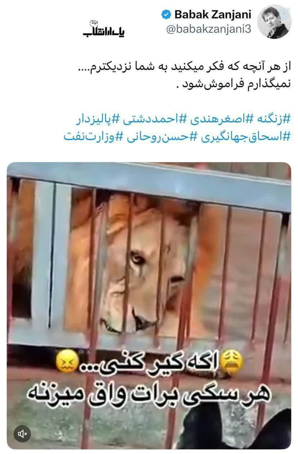 توییت ب ز علیه ب ز (بیژن زنگنه و دوستان) یک شاه دزد علیه بقیه ی شاه دزدان!! طنز تلخ اینکه که اینقدر این جماعت بازدارنده محاکمه نشدن که بعد از آزاد شدن از هتل اوین دوباره برای هم کری میخونن!! ق ق هم هیچ فقط نگاه 😑امیدی به ق ق که نیست حداقل این جماعت خودشون خودشون رو رسوا کنن