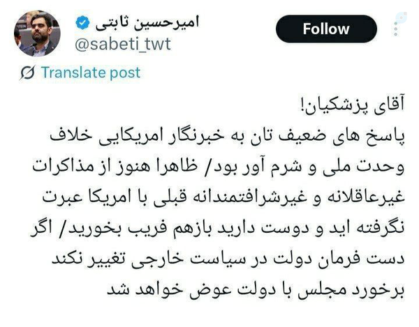 ممنون آقای ثابتی! شماحرف دل ملت ایران را زدید.اجرتان با اقا امام حسین(ع). در همین سکو از شما استدعا داریم ایشان را به مجلس فرا خوانده و بخاطر ایراد سخنان غیر مسئولانه وموضع ذلیلانه ی شان که خلاف شأن مملکت و ملت غیور ایران بوده ،موردبازخواست وپاسخگویی قرار دهید. این انتظار از سایر نمایندگان نیز هست.