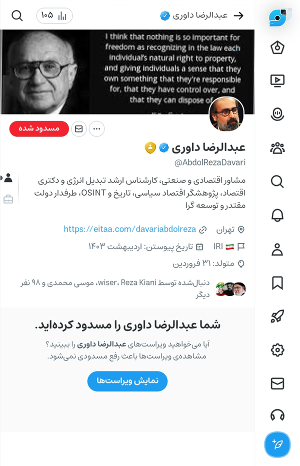 @Abbas_Dana7 July 2025Replying toبه عبدالرضا داوری واکنش نشون ندهیدآیا می دانید او فقط به دنبال واکنش شماست؟بیایید به این مجسمه حماقت هیچ واکنشی نشان ندهیمو همگی بلاکش کنیمهیچ پاسخی محکم تر از بی محلی به چنین آدم سخیفی نیست@AbdolRezaDavari#نفوذی#منافق#وطن_فروش