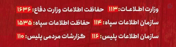 هر گونه رفت و آمدها،ماشین ها،اقدامات مشکوک را با نهادهای اطلاعاتی و امنیتی در میان بگذارید۱۱۳ وزارت اطلاعات۱۱۴ اطلاعات سپاههر کدام از ایرانیان عزیز یک سرباز وطن هستند+با اطلاع رسانی به موقع از به خاک و خون کشیده شدن هموطنان عزیزمان جلوگیری کنیم=شاید هدف بعدی دشمنان(خانه،خانواده،عزیزان شما باشند)