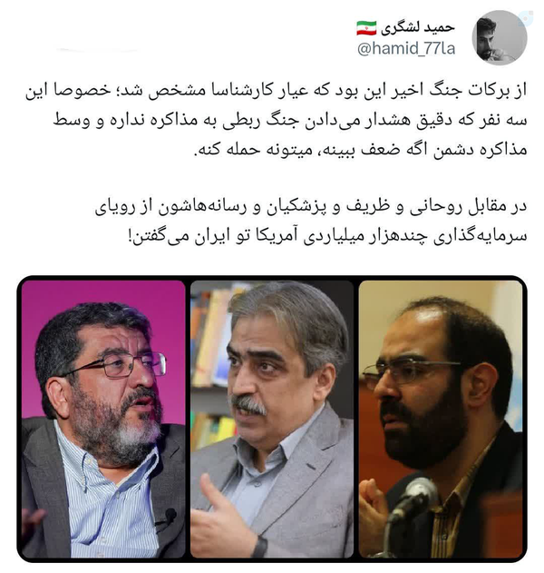 از برکات جنگ اخیر این بود که عیار کارشناسان مشخص شد؛ خصوصا این سه نفر که دقیق هشدار میدادند جنگ ربطی به مذاکره ندارد و وسط مذاکره، دشمن اگر ضعف ببیند، میتواند حمله کنددر مقابل روحانی و ظریف و رسانههاشون از رویای سرمایهگذاری چندهزار میلیاردی آمریکا در ایران میگفتند!کانال #بانوی_تمدن_ساز🔻