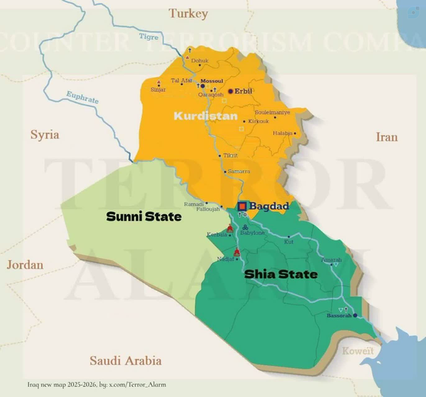 🟢"ترور آلارم"از نقشه جدید عراق طبق طرح امریکایی_صهیونیستی پرده برداشت💢 گفته میشوددر روزهای گذشته سرویس اطلاعاتی روسیه نیز به ایران هشدار داده که اسرائیل درحال همکاری اطلاعاتی باداعش در عراق برای حملات هدفمند به مواضع سپاه قدس است و در آینده تحرکی زمینی را احتمالا به سمت مرزهای ایران خواهد داشت